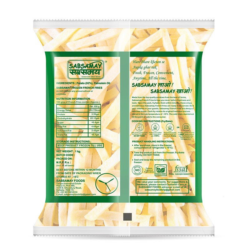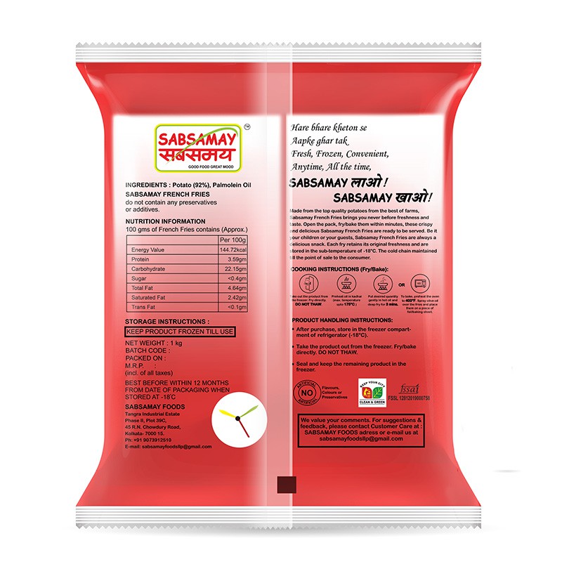Sab Samay French Fries are natural and free from any added colour, preservatives, or additives.